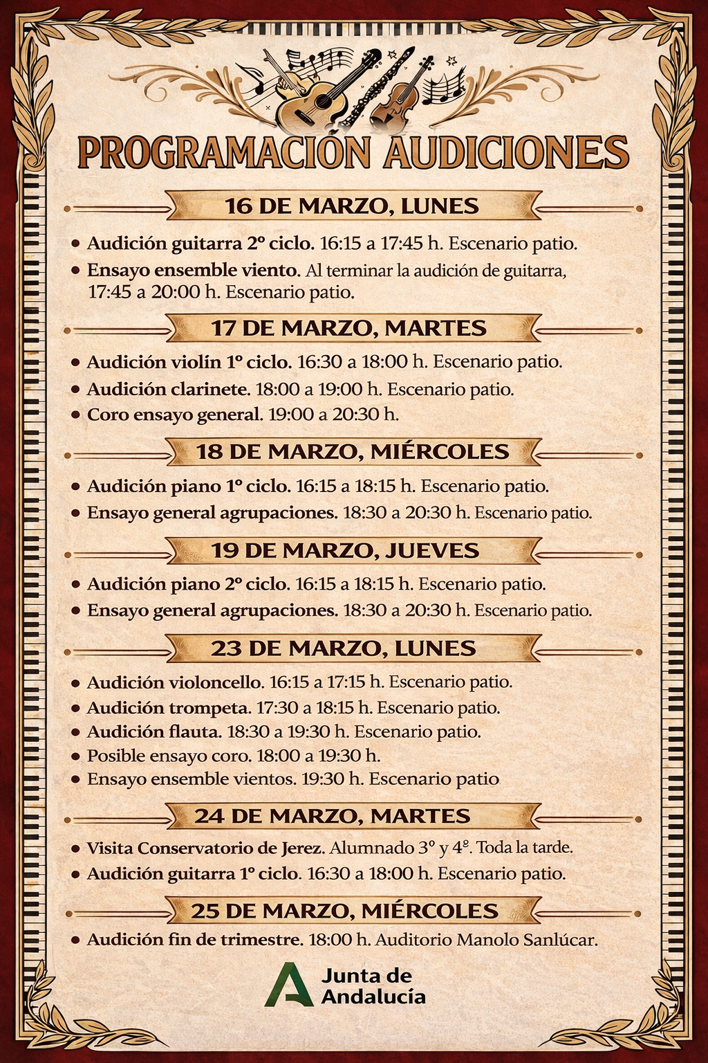 Este documento permite conocer con antelación la planificación de las audiciones y de los tiempos destinados a los ensayos, contribuyendo así a una mejor coordinación entre alumnado, profesorado y familias. Las audiciones forman parte esencial del proceso educativo en el conservatorio y requieren un ambiente adecuado de concentración, preparación y respeto.